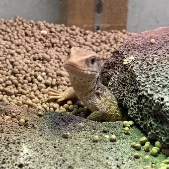 カエル顔のオオトカゲ『サバンナモニター』です( *´艸`) 最近はピンセットをカチカチ慣らすだけで溶岩プレートの下から顔を出してくれるようになりました♪餌…