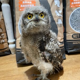 全身綿毛の状態で入荷したアフリカワシミミズクの綿毛が少なくなり始めて、大人のかっこよい羽に生え変わり始めています(^^)/・お店に来た当日・今日の姿 …