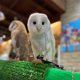 お店にいる新入荷のメンフクロウのご紹介です♪①アルビノメンフクロウ (国内ブリード)全体的に白色で存在感のあるメンフクロウです!!②番のメンフクロウと…